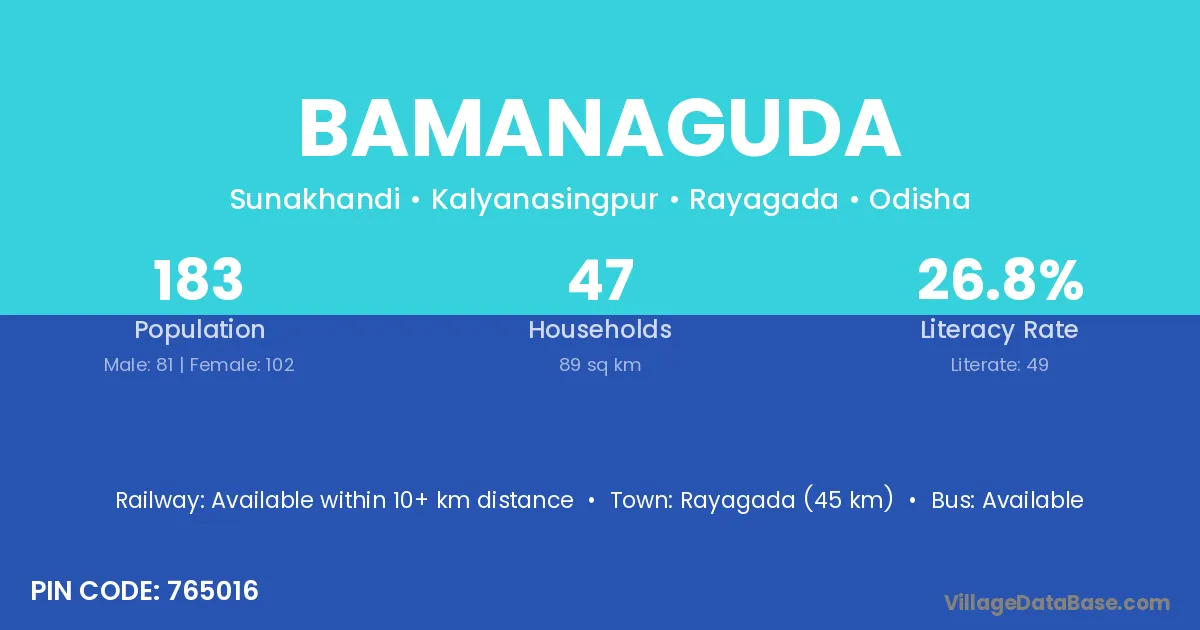 Rayagada (45 km) is the nearest town to Bamanaguda village for major economic activities and is located approximately 45 km away.