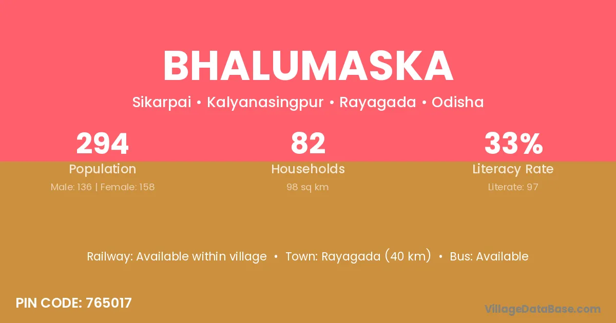 Rayagada (40 km) is the nearest town to Bhalumaska village for major economic activities and is located approximately 40 km away.