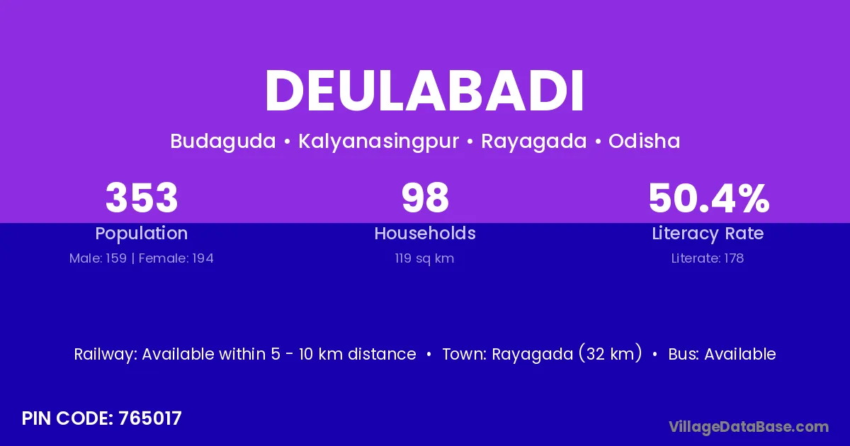 Rayagada (32 km) is the nearest town to Deulabadi village for major economic activities and is located approximately 32 km away.