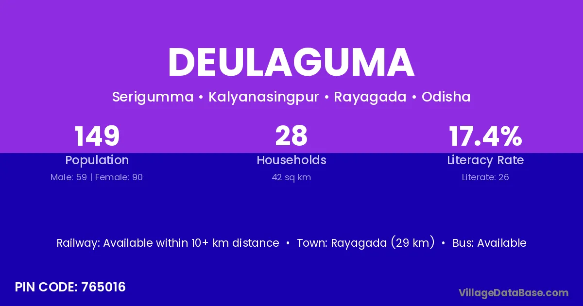 Rayagada (29 km) is the nearest town to Deulaguma village for major economic activities and is located approximately 29 km away.