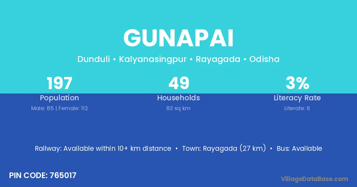 Rayagada (27 km) is the nearest town to Gunapai village for major economic activities and is located approximately 27 km away.