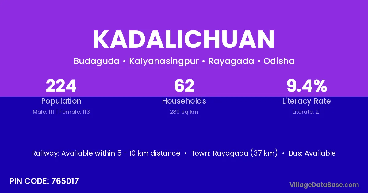 Rayagada (37 km) is the nearest town to Kadalichuan village for major economic activities and is located approximately 37 km away.