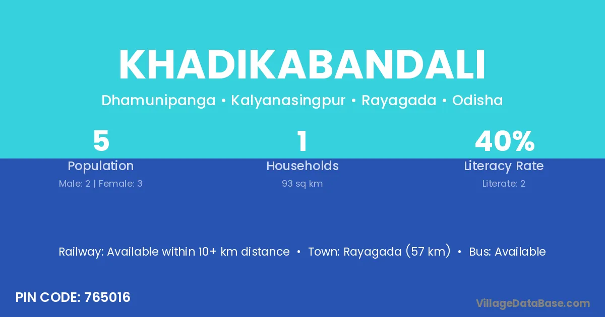 Rayagada (57 km) is the nearest town to Khadikabandali village for major economic activities and is located approximately 57 km away.