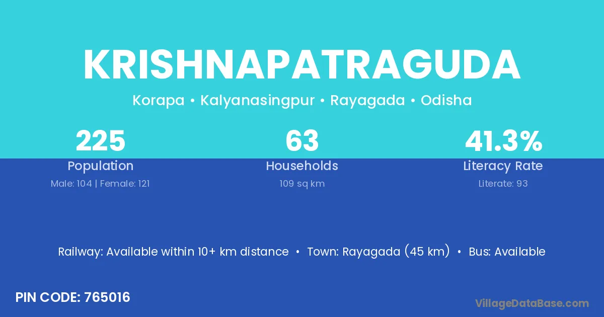 Rayagada (45 km) is the nearest town to Krishnapatraguda village for major economic activities and is located approximately 45 km away.