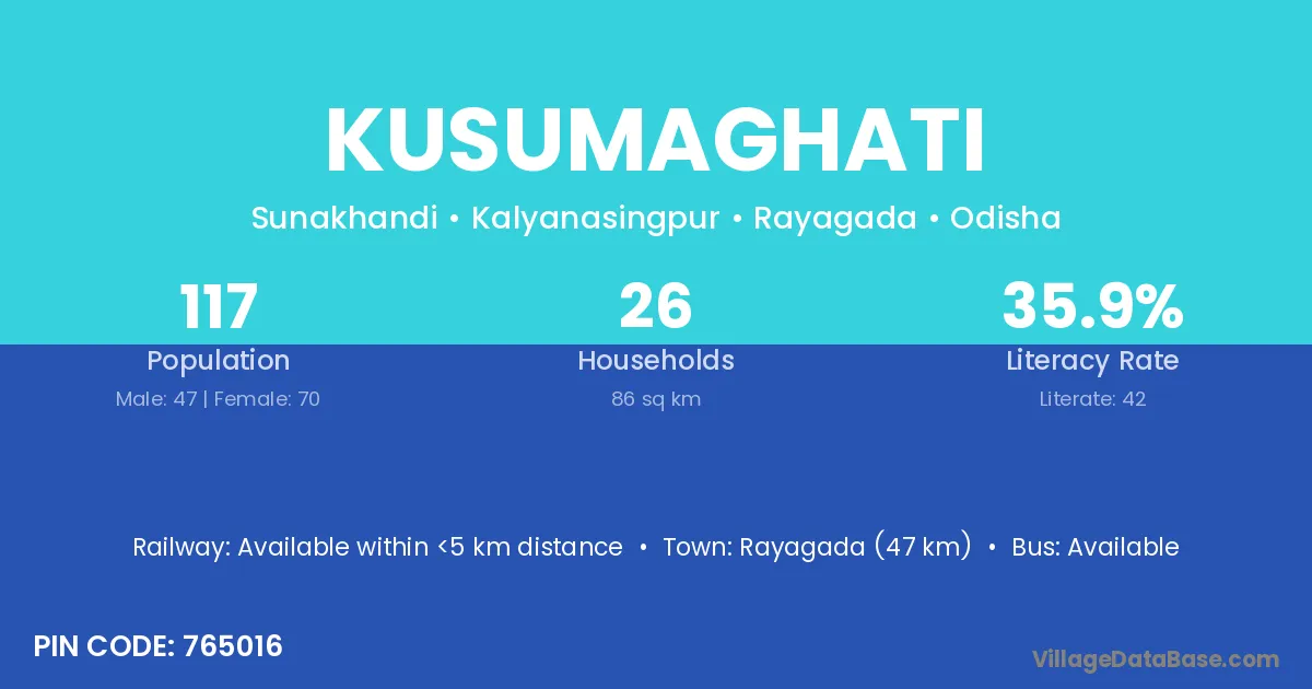 Rayagada (47 km) is the nearest town to Kusumaghati village for major economic activities and is located approximately 47 km away.