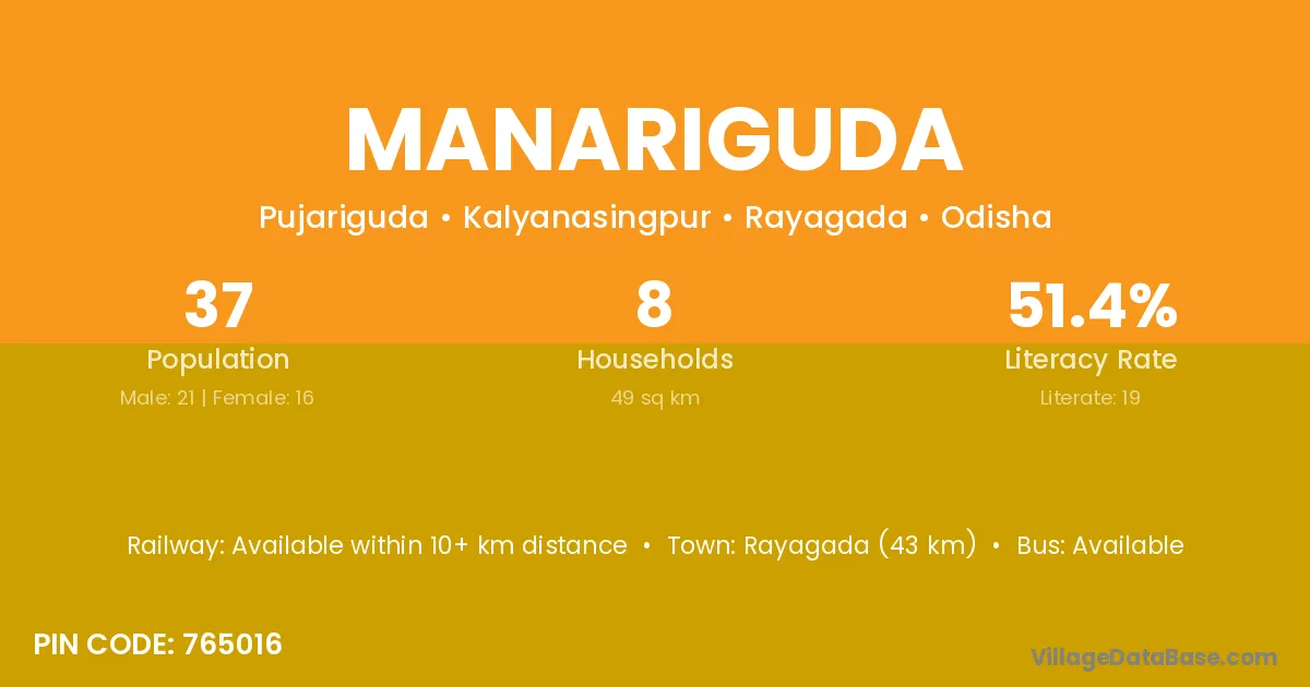 Rayagada (43 km) is the nearest town to Manariguda village for major economic activities and is located approximately 43 km away.