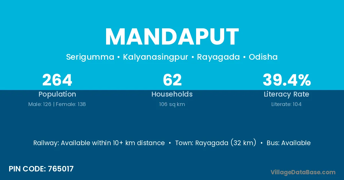 Rayagada (32 km) is the nearest town to Mandaput village for major economic activities and is located approximately 32 km away.