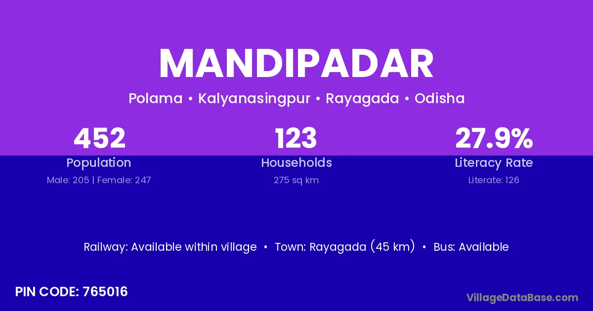Rayagada (45 km) is the nearest town to Mandipadar village for major economic activities and is located approximately 45 km away.