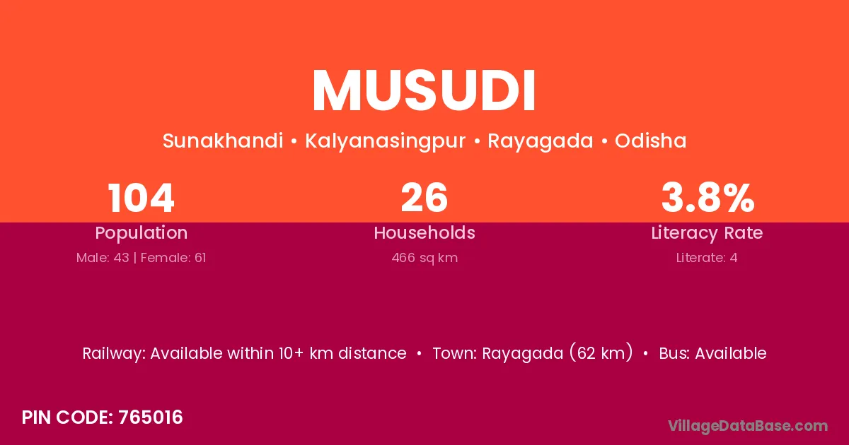 Rayagada (62 km) is the nearest town to Musudi village for major economic activities and is located approximately 62 km away.