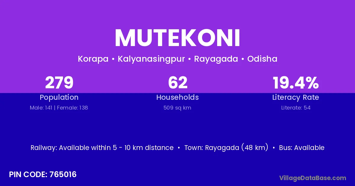 Rayagada (48 km) is the nearest town to Mutekoni village for major economic activities and is located approximately 48 km away.
