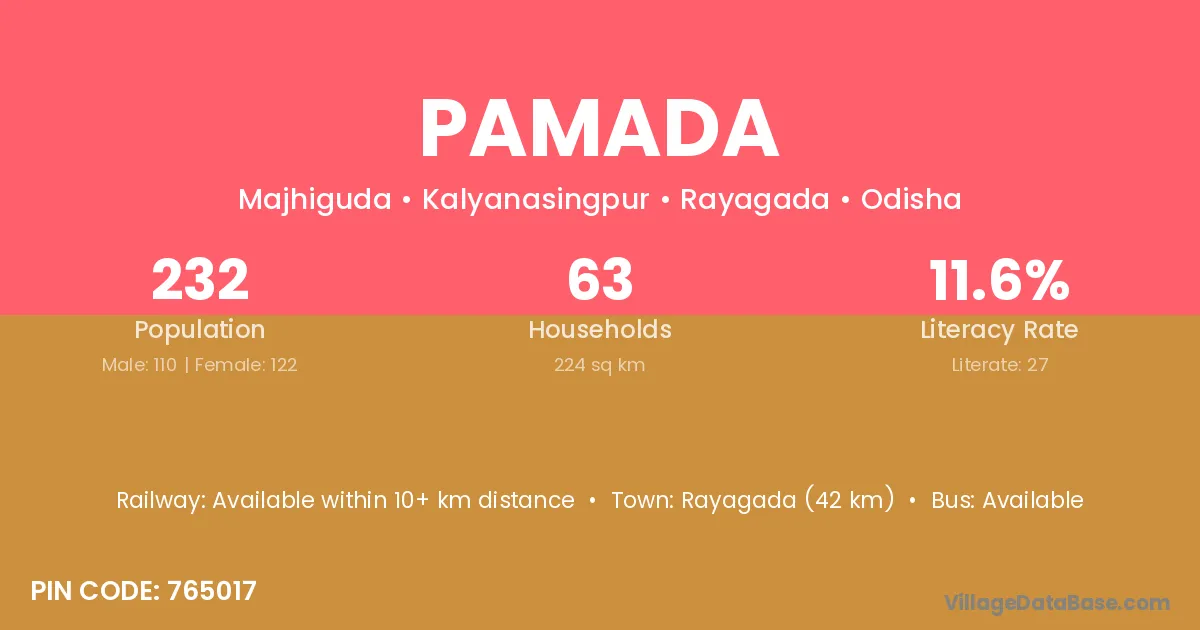 Rayagada (42 km) is the nearest town to Pamada village for major economic activities and is located approximately 42 km away.