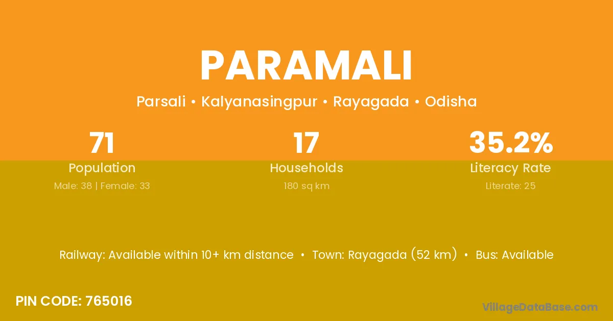 Rayagada (52 km) is the nearest town to Paramali village for major economic activities and is located approximately 52 km away.