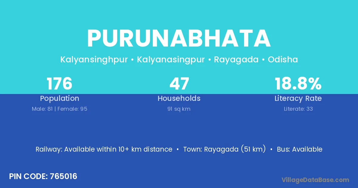 Rayagada (51 km) is the nearest town to Purunabhata village for major economic activities and is located approximately 51 km away.