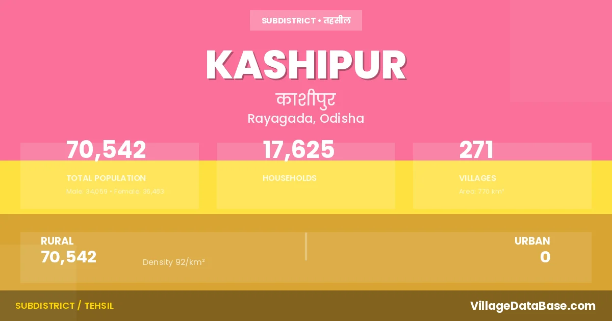 Kashipur is a town and Tehsil in the Rayagada district of the Odisha. In India, a Tehsil is a subdivision of a district responsible for the administration and revenue collection of a specific area within the district. Tehsils play a crucial role in the local governance structure, contributing significantly to the development and administration of their communities.