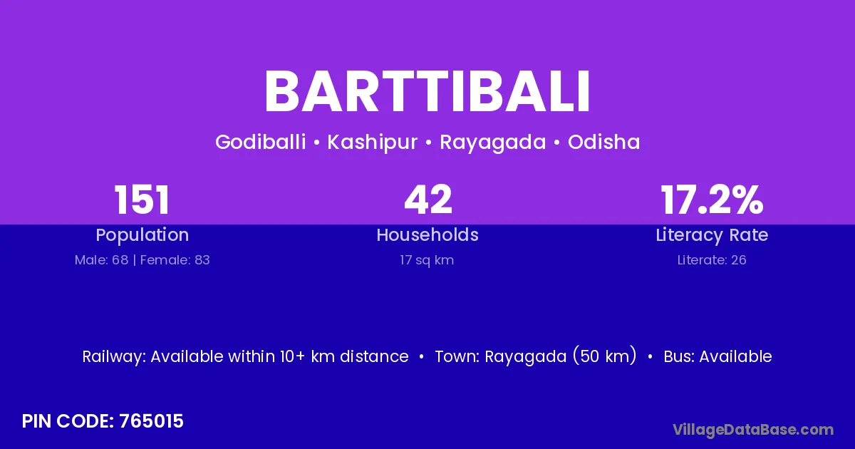 Rayagada (50 km) is the nearest town to Barttibali village for major economic activities and is located approximately 50 km away.