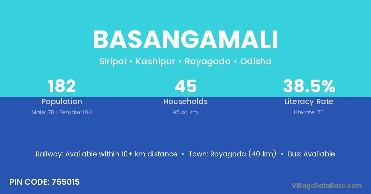 Rayagada (40 km) is the nearest town to Basangamali village for major economic activities and is located approximately 40 km away.