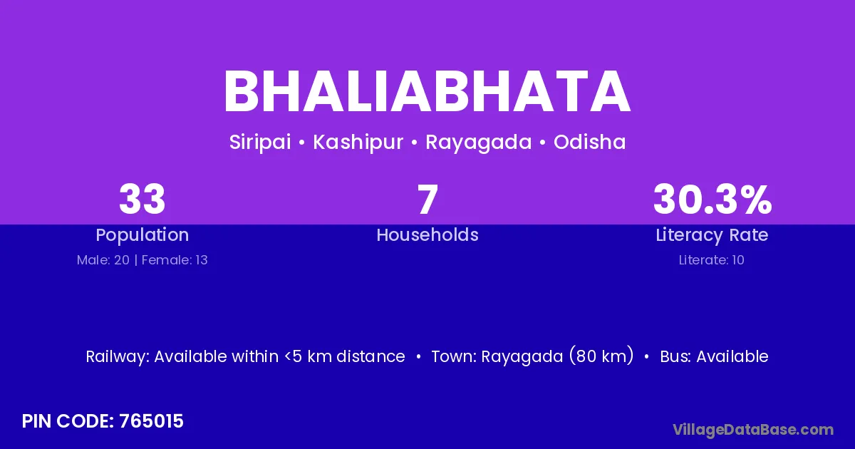 Rayagada (80 km) is the nearest town to Bhaliabhata village for major economic activities and is located approximately 80 km away.
