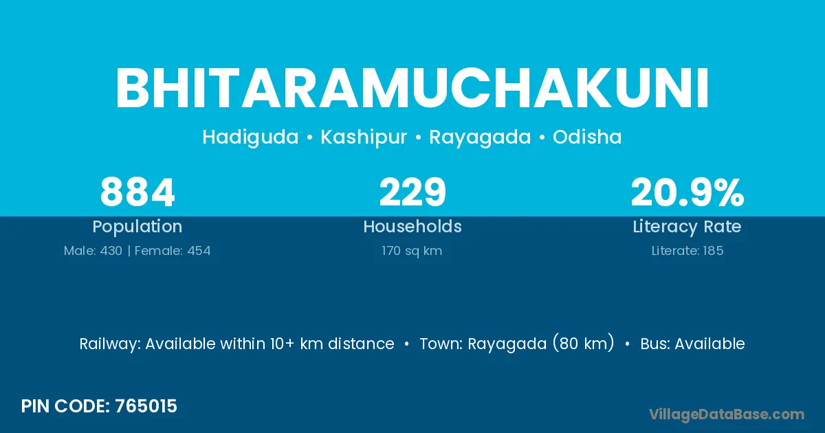 Rayagada (80 km) is the nearest town to Bhitaramuchakuni village for major economic activities and is located approximately 80 km away.
