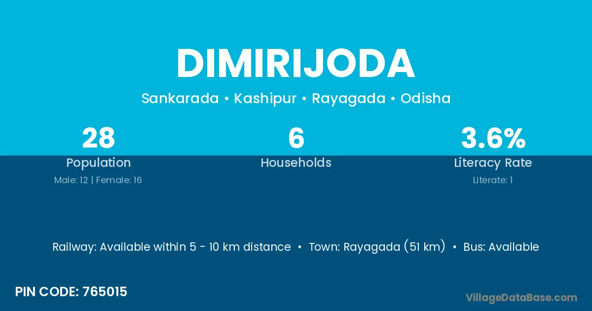Rayagada (51 km) is the nearest town to Dimirijoda village for major economic activities and is located approximately 51 km away.