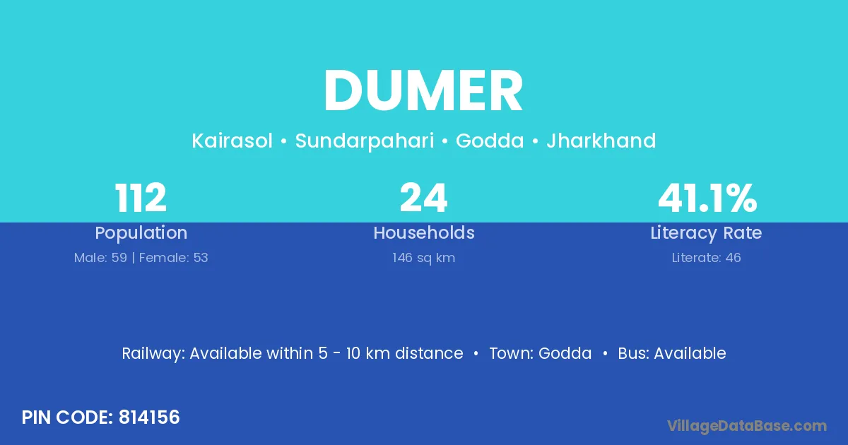 The literacy rate of Dumer village is 58.62%. Male literacy stands at 70.27% and female literacy at 47.93%.