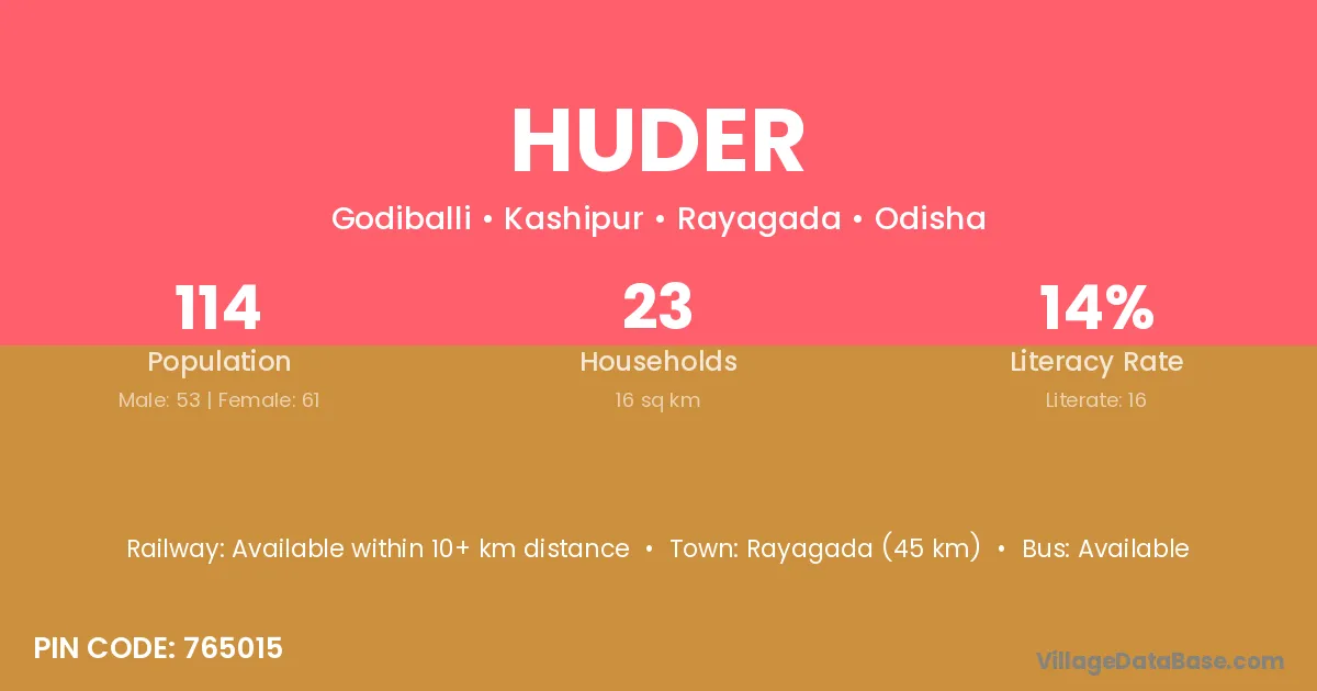 Rayagada (45 km) is the nearest town to Huder village for major economic activities and is located approximately 45 km away.