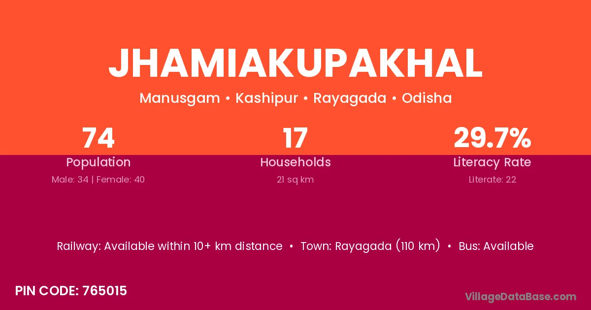 Jhamiakupakhal village has a total population of 74 people, of which 34 are males and 40 are females.
