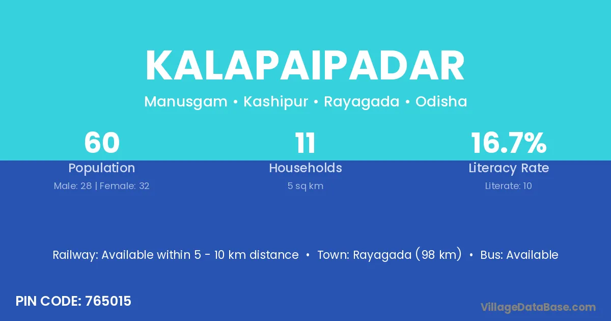 Rayagada (98 km) is the nearest town to Kalapaipadar village for major economic activities and is located approximately 98 km away.