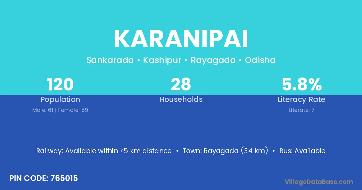 Karanipai village has a total population of 120 people, of which 61 are males and 59 are females.