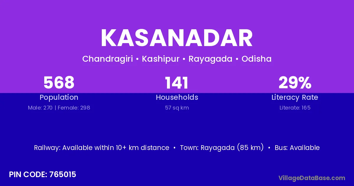 Rayagada (85 km) is the nearest town to Kasanadar village for major economic activities and is located approximately 85 km away.