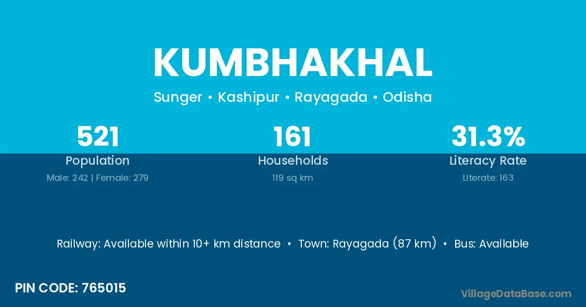 Rayagada (87 km) is the nearest town to Kumbhakhal village for major economic activities and is located approximately 87 km away.