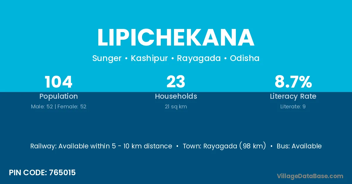 Lipichekana village has a total population of 104 people, of which 52 are males and 52 are females.