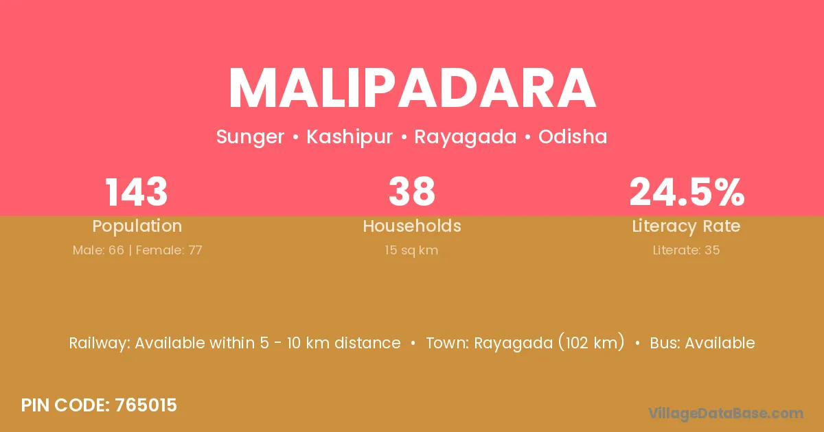 Rayagada (102 km) is the nearest town to Malipadara village for major economic activities and is located approximately 102 km away.