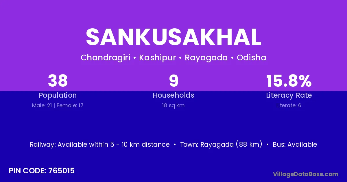Sankusakhal village has a total population of 38 people, of which 21 are males and 17 are females.
