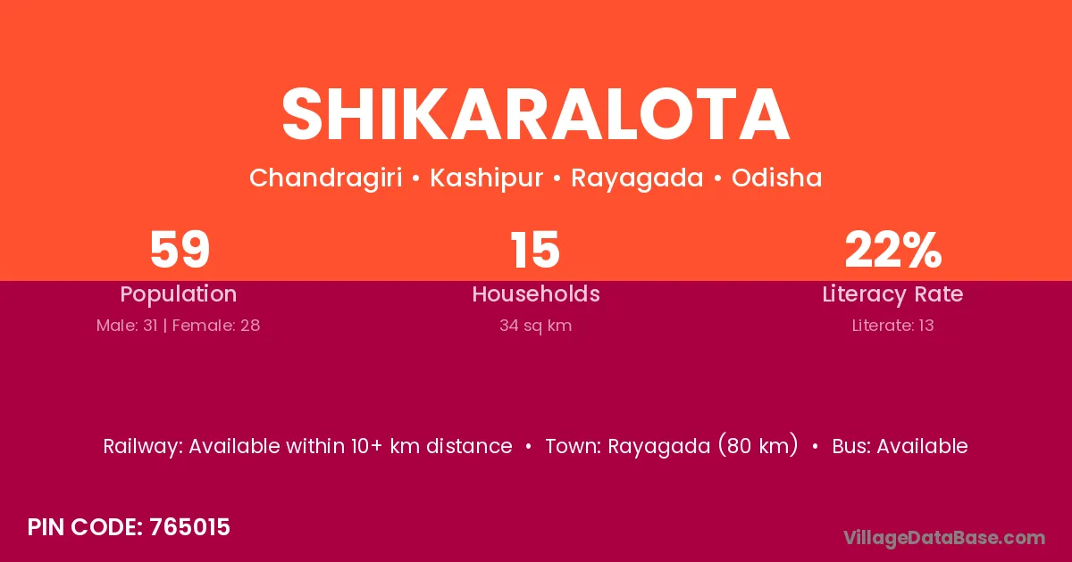 Rayagada (80 km) is the nearest town to Shikaralota village for major economic activities and is located approximately 80 km away.