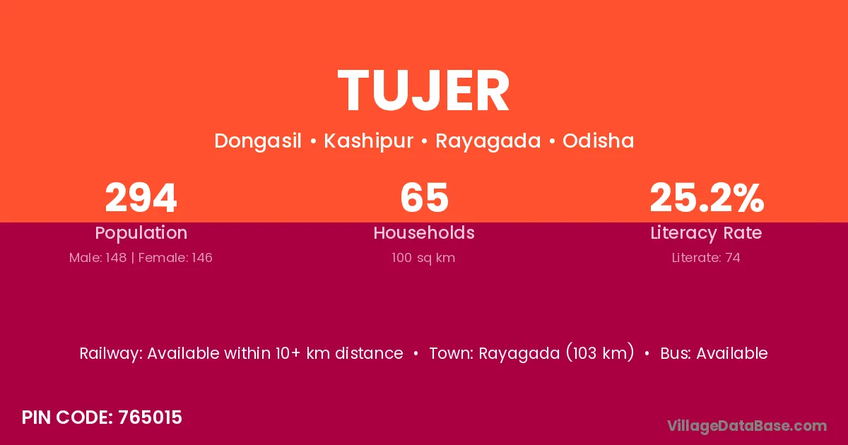 Rayagada (103 km) is the nearest town to Tujer village for major economic activities and is located approximately 103 km away.