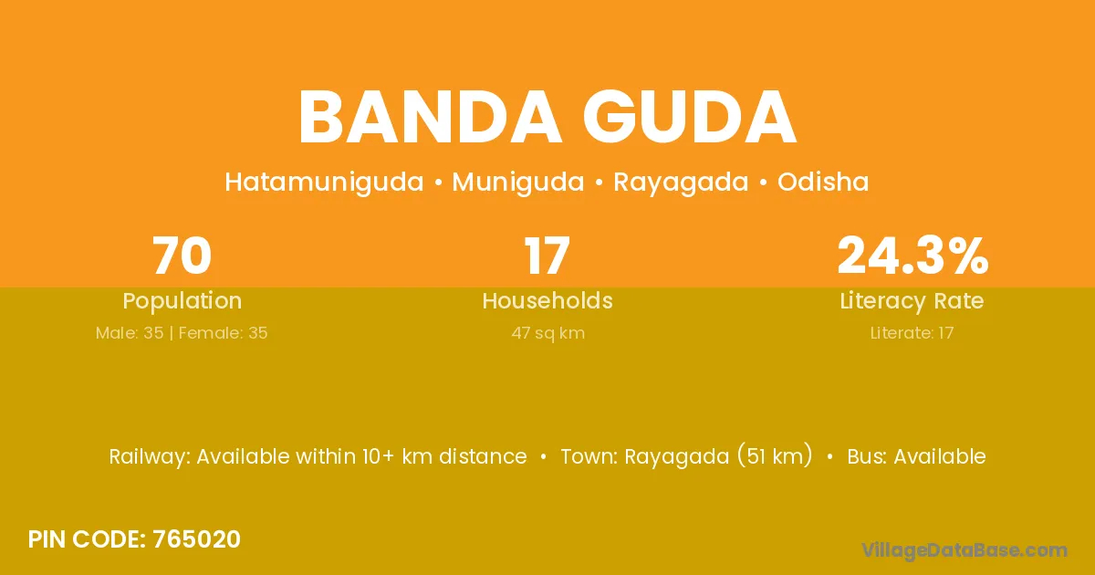Rayagada (51 km) is the nearest town to Banda Guda village for major economic activities and is located approximately 51 km away.