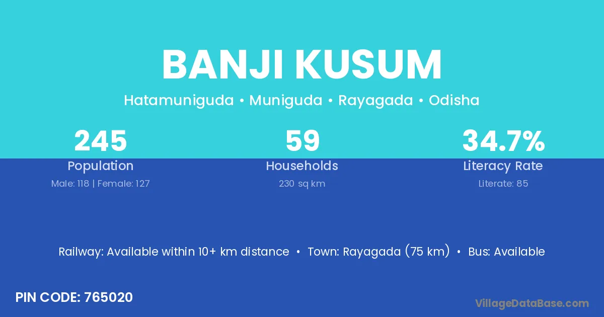 Rayagada (75 km) is the nearest town to Banji Kusum village for major economic activities and is located approximately 75 km away.