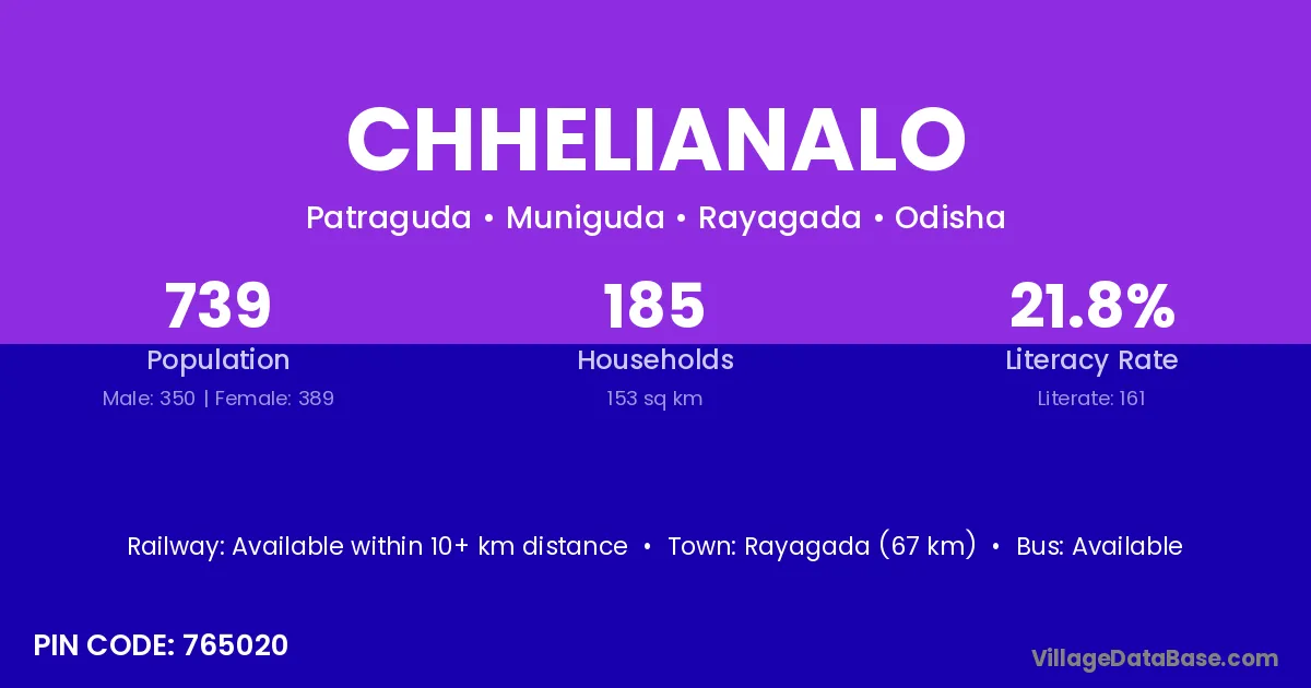 Rayagada (67 km) is the nearest town to Chhelianalo village for major economic activities and is located approximately 67 km away.