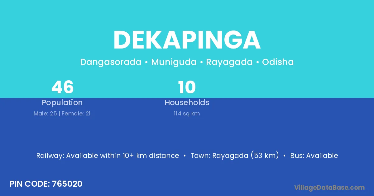 Rayagada (53 km) is the nearest town to Dekapinga village for major economic activities and is located approximately 53 km away.