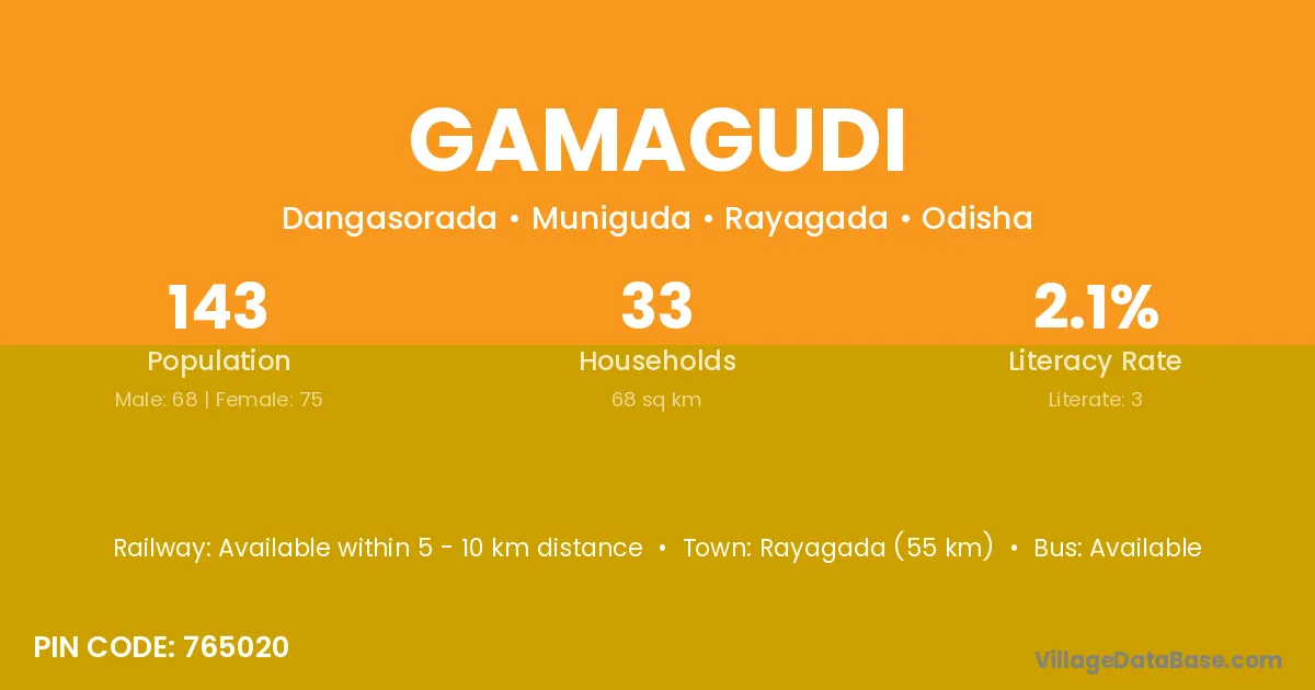 Rayagada (55 km) is the nearest town to Gamagudi village for major economic activities and is located approximately 55 km away.