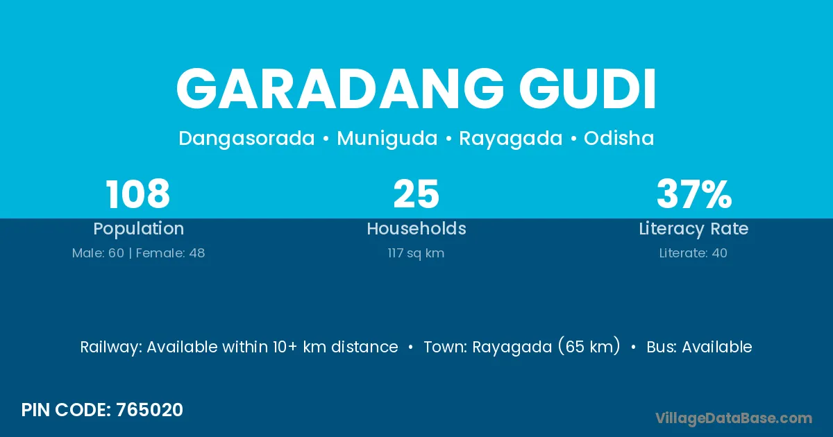 Rayagada (65 km) is the nearest town to Garadang Gudi village for major economic activities and is located approximately 65 km away.