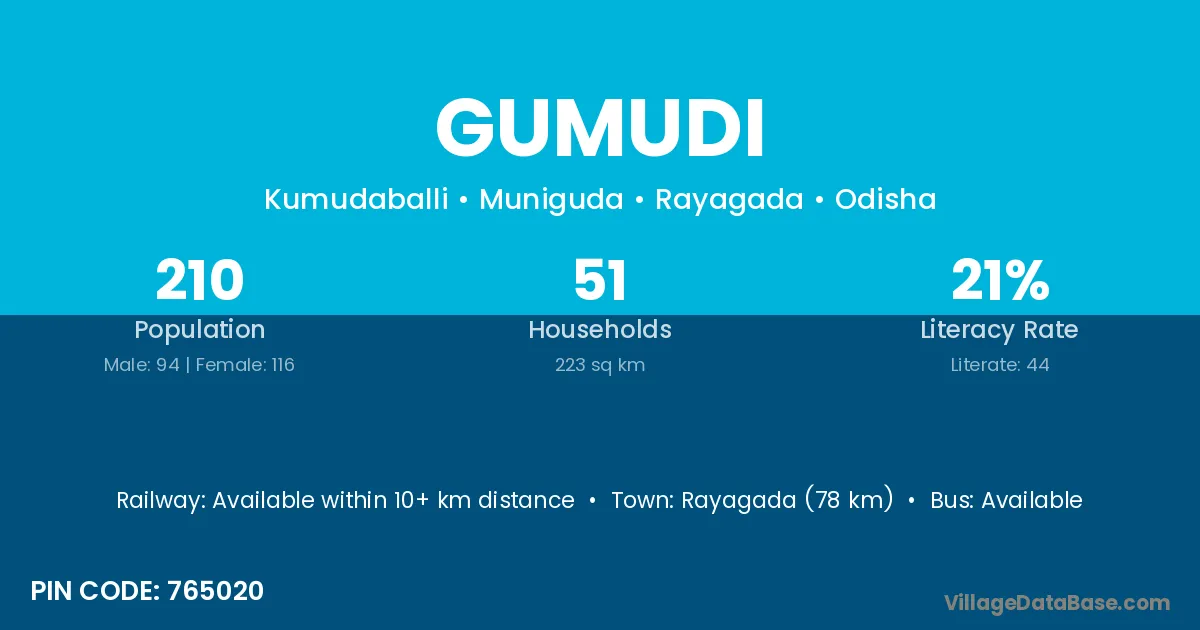 Rayagada (78 km) is the nearest town to Gumudi village for major economic activities and is located approximately 78 km away.