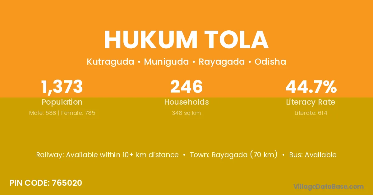 Rayagada (70 km) is the nearest town to Hukum Tola village for major economic activities and is located approximately 70 km away.