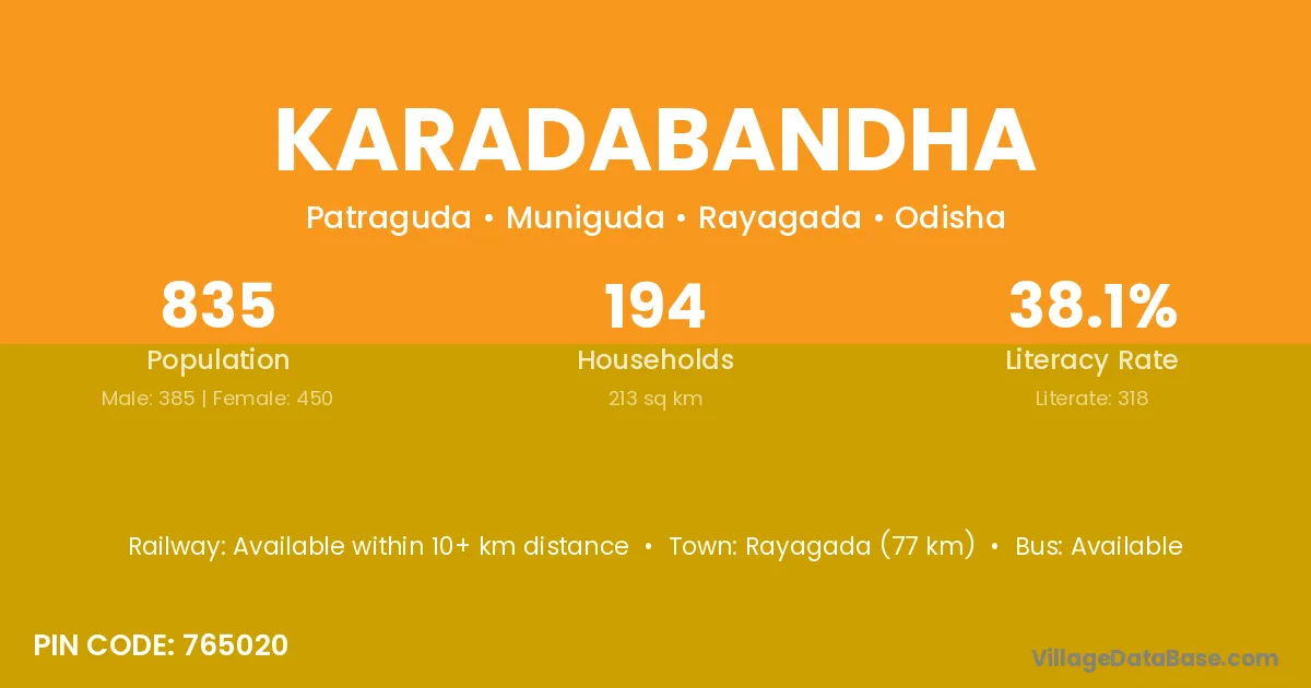 Rayagada (77 km) is the nearest town to Karadabandha village for major economic activities and is located approximately 77 km away.