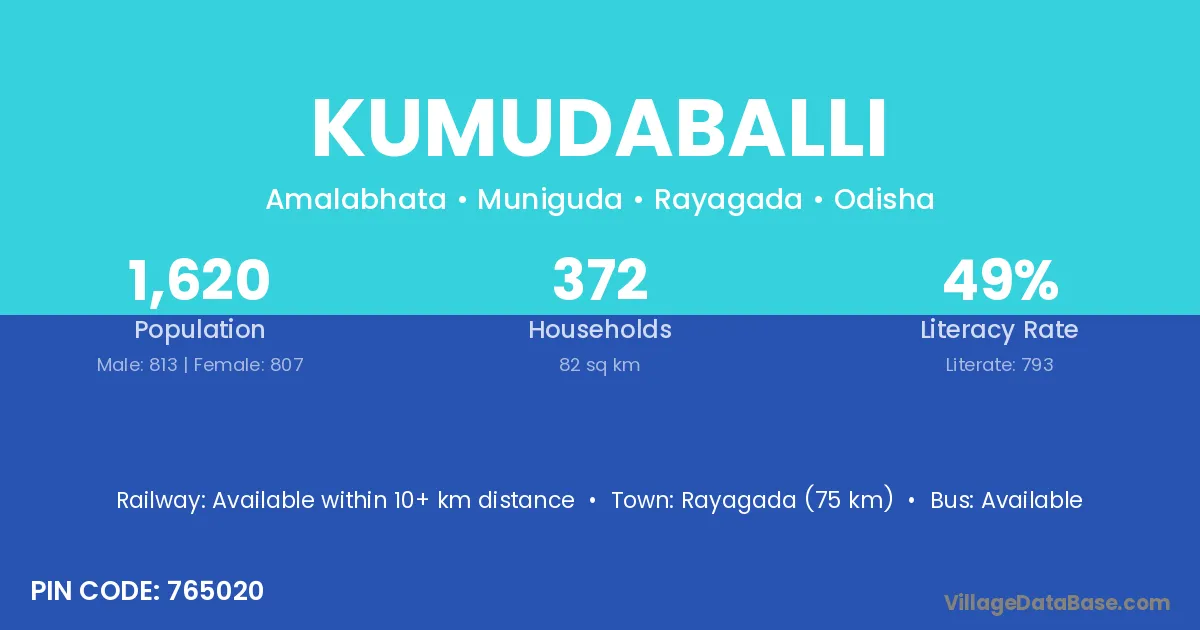 Rayagada (75 km) is the nearest town to Kumudaballi village for major economic activities and is located approximately 75 km away.