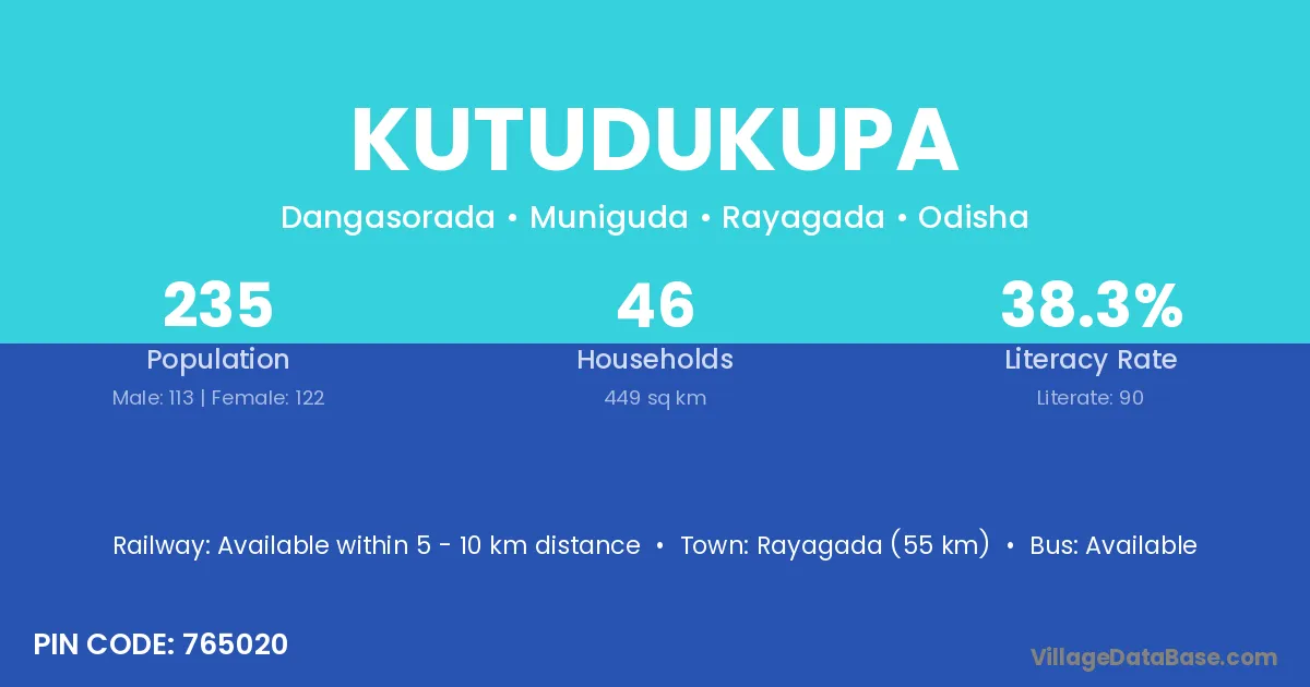 Rayagada (55 km) is the nearest town to Kutudukupa village for major economic activities and is located approximately 55 km away.
