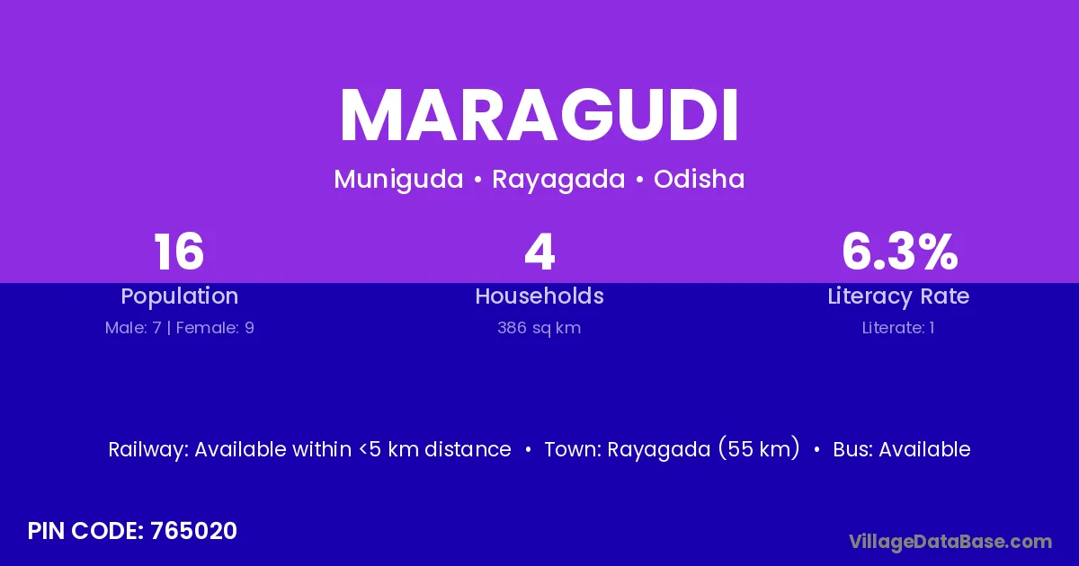 Rayagada (55 km) is the nearest town to Maragudi village for major economic activities and is located approximately 55 km away.