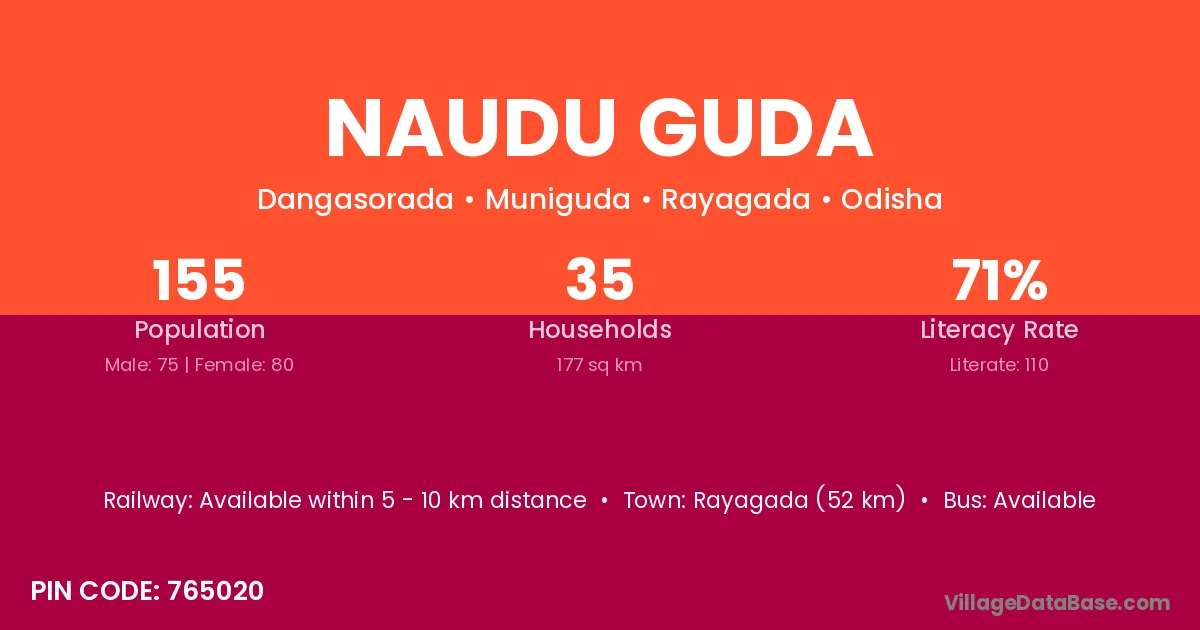Rayagada (52 km) is the nearest town to Naudu Guda village for major economic activities and is located approximately 52 km away.