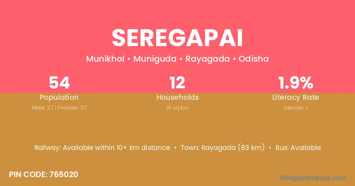 Rayagada (83 km) is the nearest town to Seregapai village for major economic activities and is located approximately 83 km away.