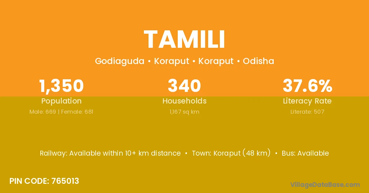 Rayagada (77 km) is the nearest town to Tamili village for major economic activities and is located approximately 77 km away.